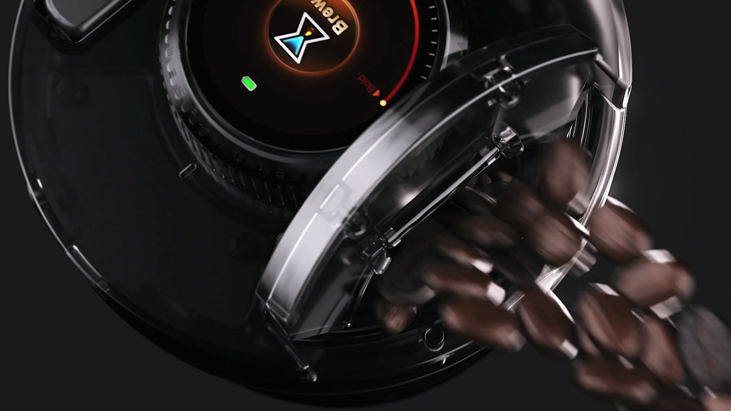 An integrated hopper stores whole coffee beans separately from the water system and feeds them directly into the grinder, keeping beans dry and fresh until each brew.
